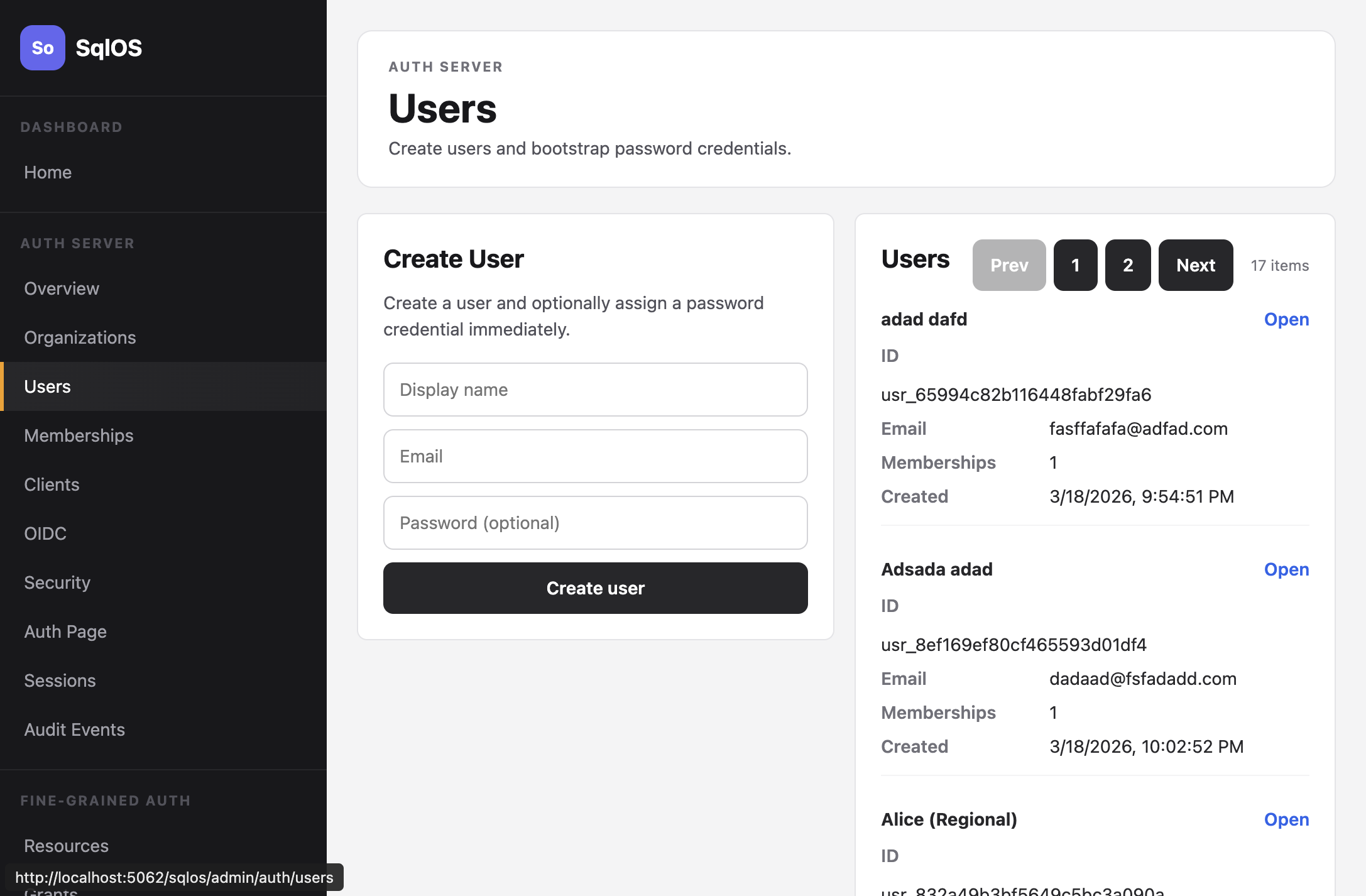 The auth admin UI at /sqlos/admin/auth/ lets you manage organizations, users, memberships, clients, OIDC connections, SSO, security settings, and active sessions.
