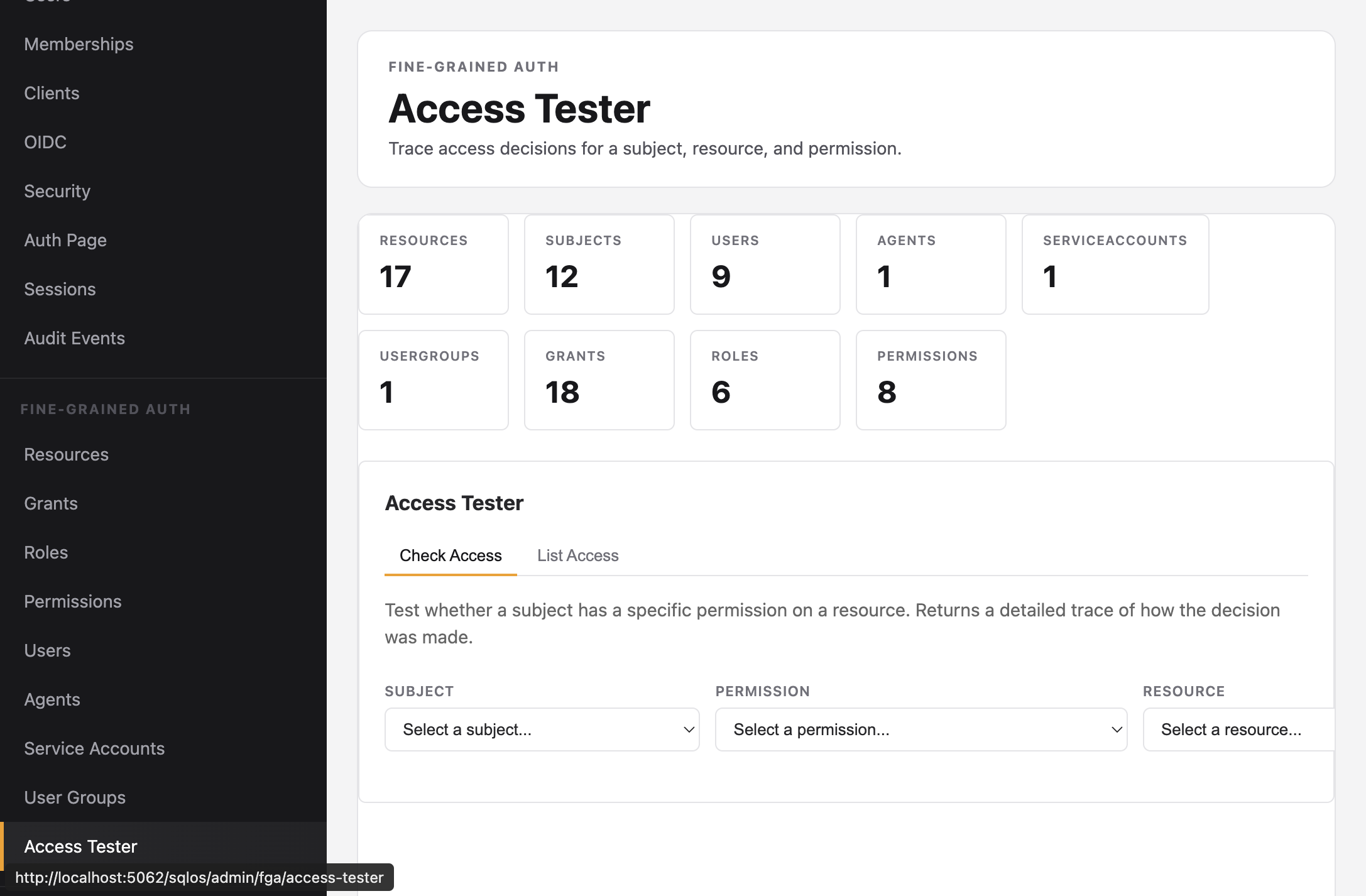Test access decisions visually in the dashboard at Fine-Grained Auth > Access Tester.