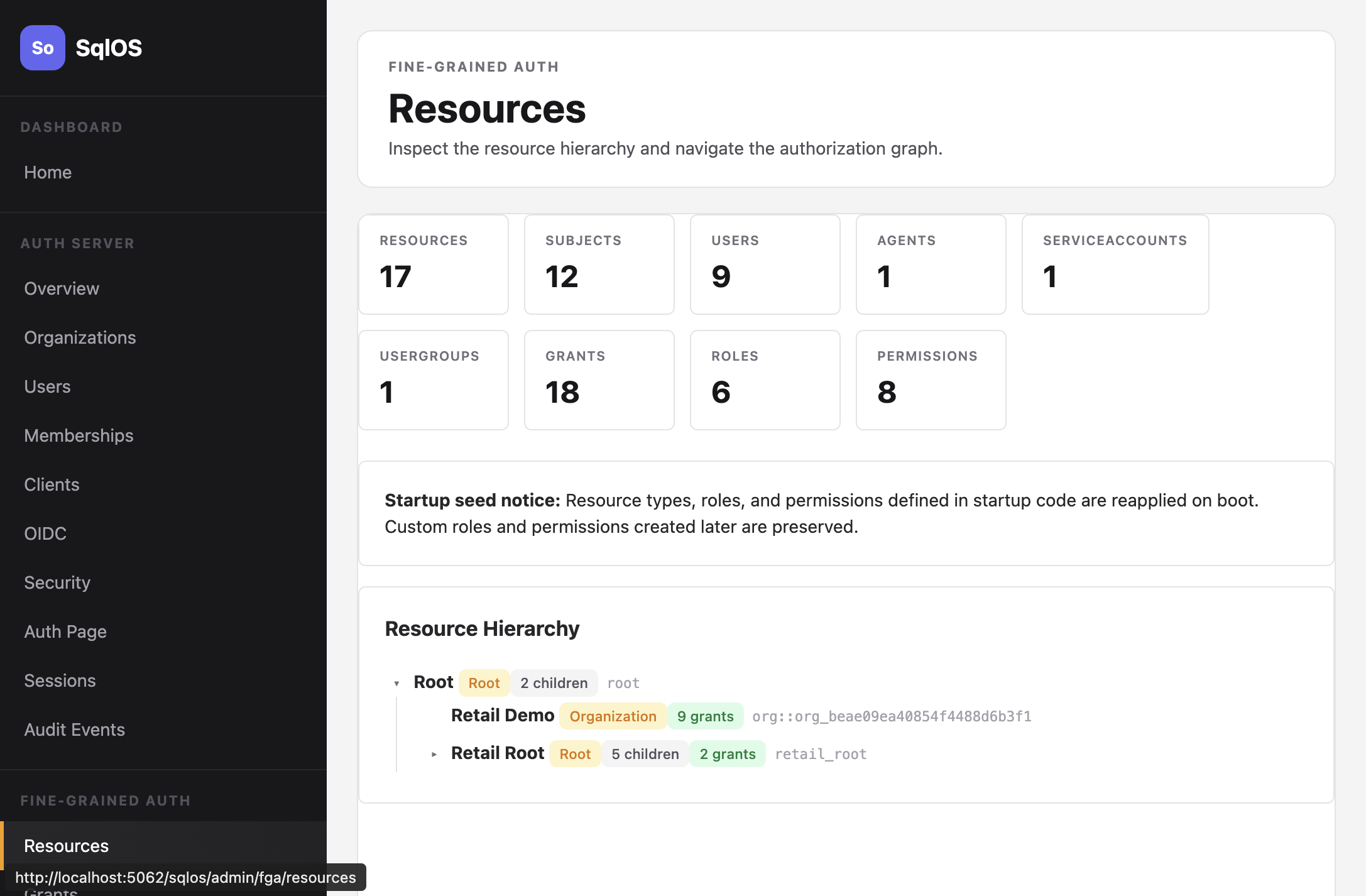 The FGA admin UI at /sqlos/admin/fga/ lets you browse the resource hierarchy, manage grants, define roles and permissions, and test access decisions.
