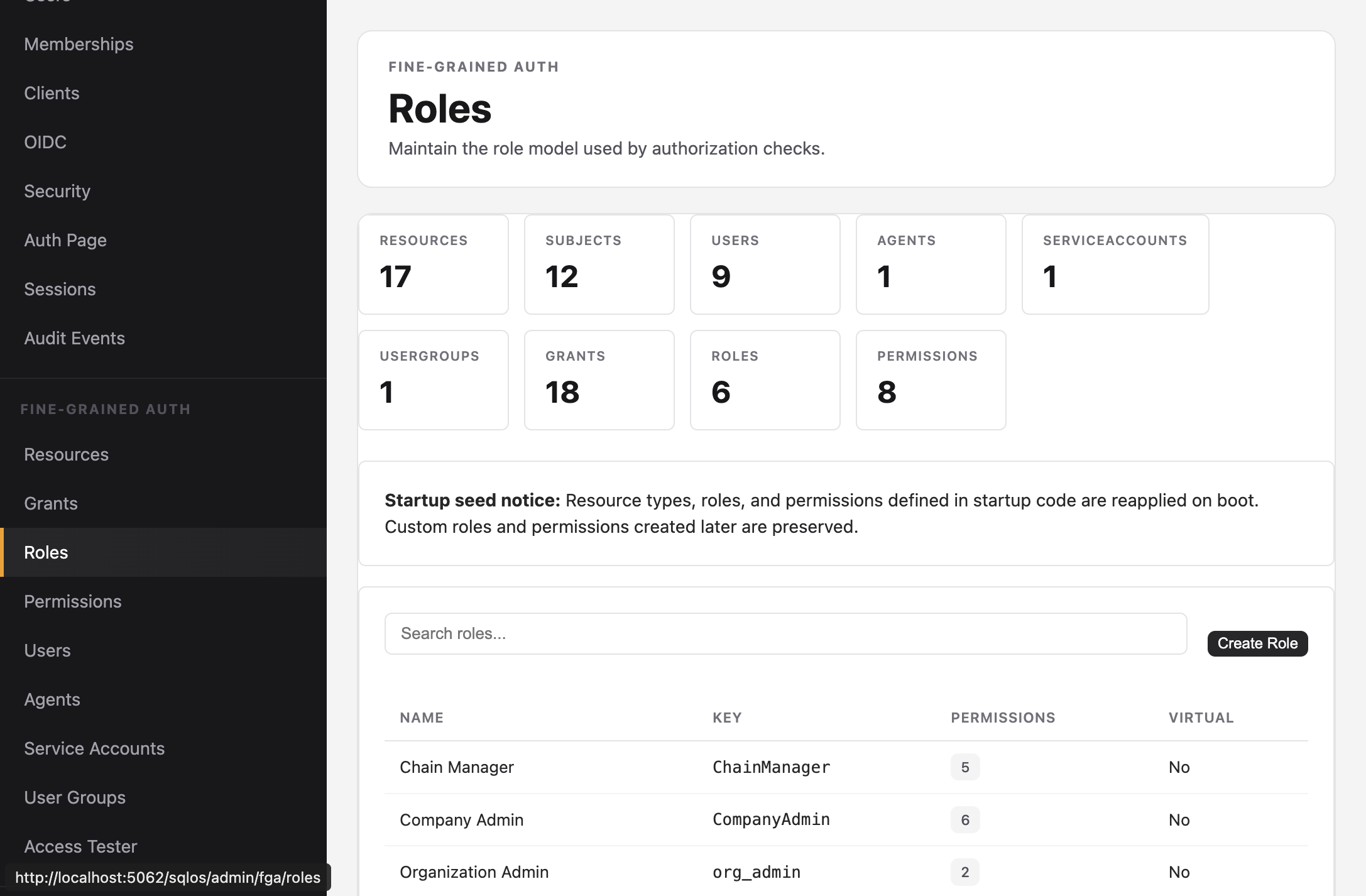 The FGA section of the SqlOS dashboard lets you inspect and manage the authorization model visually.